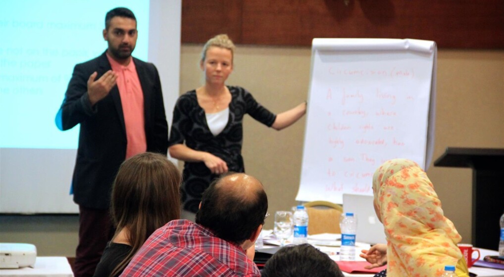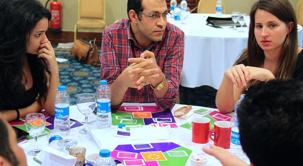 Gruppedeltagerne drøfter hvilke tre værdier, de alle kan blive enige om som de vigtigste.