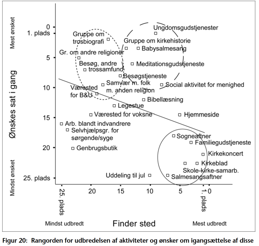 Den stiplede cirkel øverst til venstre er de aktiviteter, som er mest ønsket og mindst udbredt i sognene: I denne gruppe handler 3 ud af 5 aktiviteter om religionsmøde. (s. 94)
