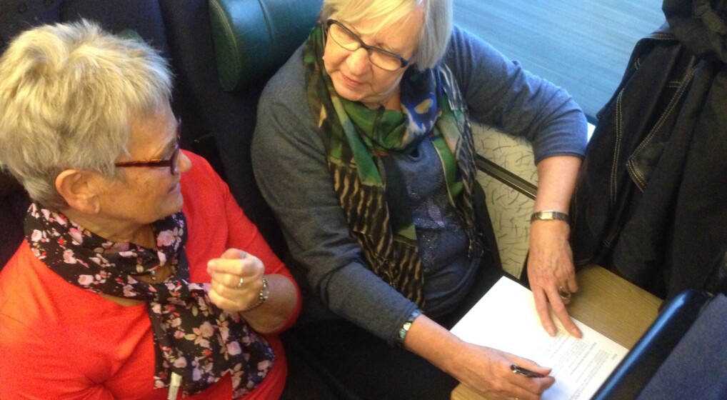 I toget til Göteborg sparrer netværksdeltagerne med hinanden vedr. erfaringerne hjemme i sognet.