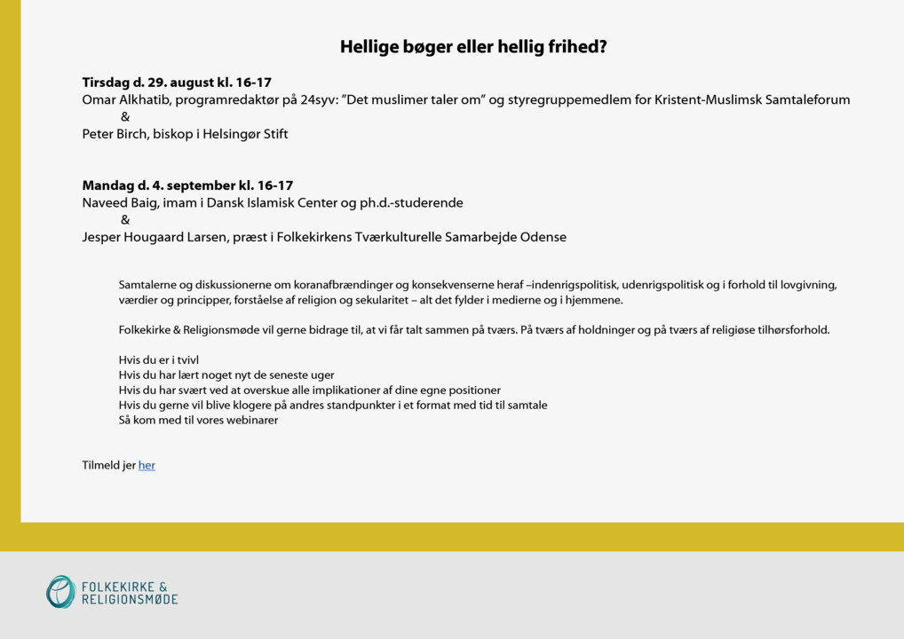 Samtaler mellem muslimske og folkekirkelige repræsentanter om koranafbrændinger, åndsfrihed og forholdet til det hellige. Se de optagede webinarer her.